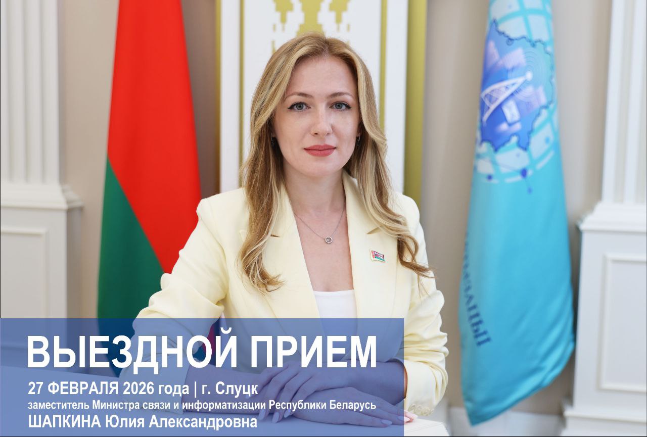 27 февраля 2026 года с 12.00 до 13.00 в Слуцком зональном узле электросвязи Минского филиала РУП «Белтелеком» заместитель Министра связи и информатизации Республики Беларусь Шапкина Юлия Александровна проведет выездной прием граждан и юридических лиц с одновременным подключением «прямой телефонной линии» по телефону: + 375 (1795) 24100.Жители г. Слуцка и Слуцкого района смогут задать вопросы, затрагивающие деятельность в области связи (как почтовой, так и электросвязи) и цифрового развития.📍Место проведения приема: Слуцкий ЗУЭС РУП «Белтелеком», г. Слуцк, ул. М. Богдановича, д. 2/1, кабинет № 409 (приемная).📝Предварительная запись на прием осуществляется с 23 по 26 февраля с 9.00 до 17:00 по телефону: + 375 (1795) 57290. Малюнак PDF