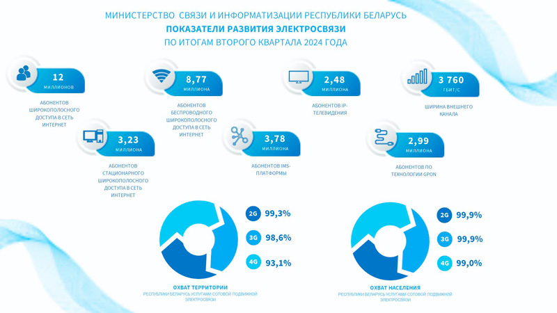 Министерство связи и информатизации как орган регулятор обеспечивает полноценное и всестороннее развитие информационно-коммуникационной инфраструктуры для удовлетворения возрастающих потребностей государства бизнеса и граждан в получении современных и качественных услуг электросвязи. Необходимо отметить, что на сегодняшний день лицензию в области электросвязи имеют 167 операторов электросвязи. Основным направлением развития сети электросвязи РУП «Белтелеком» является завершение процесса переключения абонентов на программно-аппаратную IMS-платформу, что позволяет предоставлять абонентам весь спектр современных телекоммуникационных услуг по одной абонентской линии. На конец отчетного квартала к IMS-платформе было подключено 3 781,3 тыс. абонентов с приростом к началу года в 8,4 тыс. Строительство мультисервисных сетей позволяет не только улучшить качество и расширить перечень предоставляемых услуг, но и оптимизировать затраты на эксплуатацию сетей электросвязи. С учетом развития услуг сети передачи данных растет число подключений к услугам широкополосного доступа, что оказывает влияние и на ширину внешнего канала доступа в сеть Интернет. Внешний шлюз для доступа в сеть Интернет постоянно расширяется также для повышения качества оказываемых услуг по доступу в сеть Интернет, резервирования и уменьшения нагрузки на отдельные направления. За январь-июнь 2024 года ширина внешнего канала для доступа в сеть Интернет была увеличена на 130 Гбит/с и составила на 1 июля 2024 г. 3 760 Гбит/с. С целью модернизации существующих сетей передачи данных для улучшения качества и объема предоставляемых услуг продолжались работы по подключению абонентов с применением технологии пассивных оптических сетей (GPON), позволяющей обеспечить скорость передачи данных до 100 Мбит/с и выше. По состоянию на 1 июля 2024 г. количество абонентов, подключенных по данной технологии, составило порядка 2 994,5 тыс. и увеличилось с начала года на 40,9 тысячи. Всего количество абонентов стационарного широкополосного доступа к сети Интернет составило 3 235,8 тыс. с приростом к началу года в 36,9 тыс., при этом уровень проникновения стационарного широкополосного доступа к сети Интернет на 100 жителей составил 35,34 ед. Стоит отметить активное развитие услуги телевидения по Интернет-протоколу. За январь-июнь 2024 года количество абонентов IP-телевидения составило 2 478,5 тыс. абонентов. Обеспечено дальнейшее развитие услуг сотовой подвижной электросвязи. По состоянию на 1 июля 2024 года общее количество абонентов сотовой подвижной электросвязи в республике составило 11 841 тыс. Уровень проникновения сотовой подвижной электросвязи в республике составил 129,3 абонента на 100 жителей. Сотовой подвижной электросвязью второго и третьего поколения охвачено 99,3 процентов и 98,6 процентов территории республики соответственно, на которой проживает 99,9 процентов населения. Активно развивалась сеть сотовой подвижной электросвязи стандарта LTE и услуги на ее основе. За январь-июнь 2024 года охват населения услугами сотовой подвижной электросвязи стандарта LTE составил 99,0 процентов. Развитие сетей сотовой подвижной электросвязи третьего и четвертого поколения обеспечивает стабильный рост абонентов беспроводного широкополосного доступа к сети Интернет: количество абонентов беспроводного широкопол