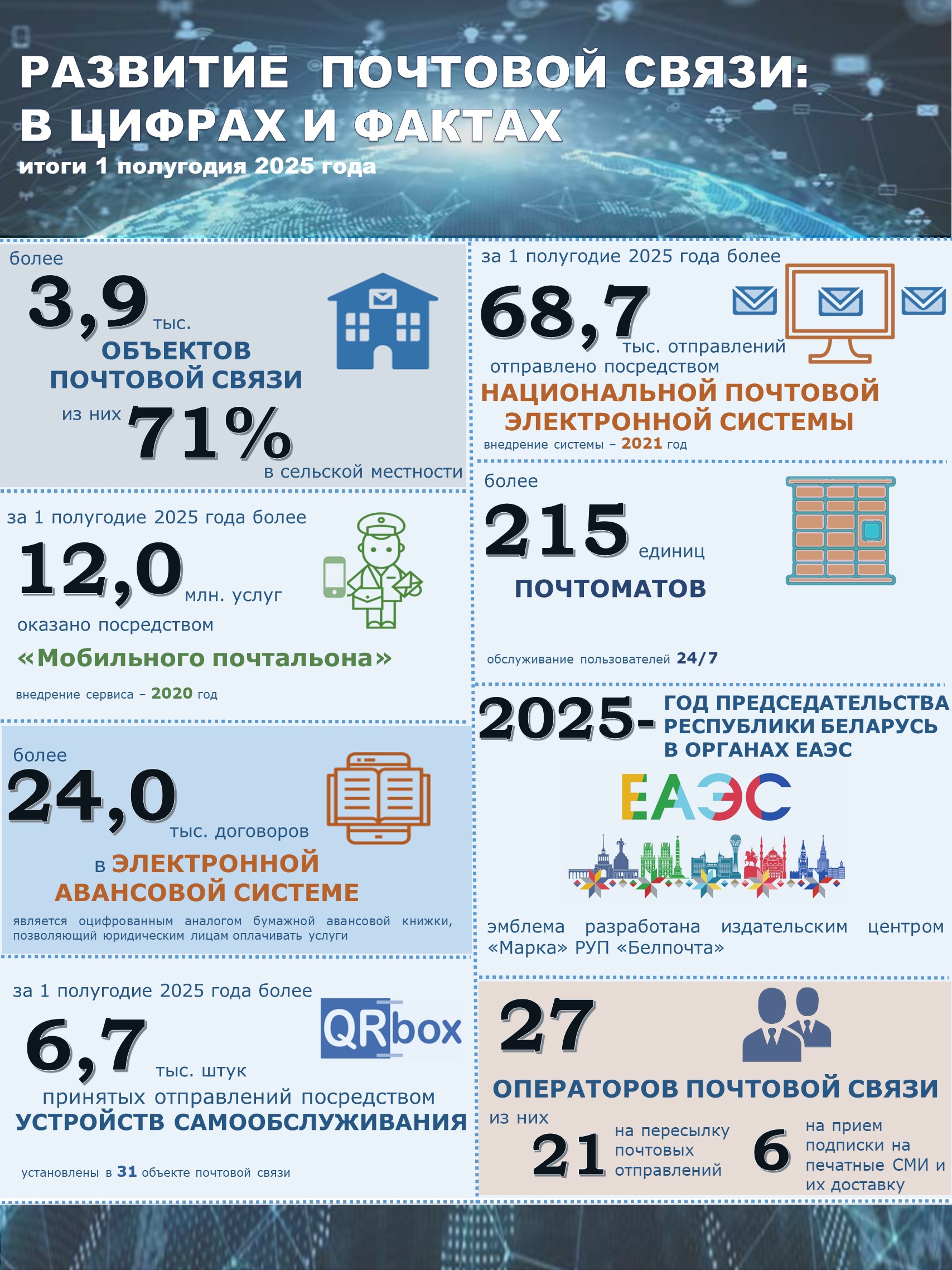 Today, the postal network in the Republic of Belarus has more than 3,900 postal facilities with 71% of facilities located in rural areas.27 postal operators have a license to provide public postal services for sending postal items, accepting subscriptions to printed media and their delivery, 21 of them have a license to provide postal forwarding services and 6 of them have a license to accept subscriptions to print media and their delivery.Innovations and achievements in the field of postal services implemented recently on the basis of IT technologies include the development of the national postal electronic system, electronic prepayment system, “Mobile Postman” service, QR box self-service devices, as well as the expansion of the parcel lockers network.The National Postal Electronic System is a convenient and fast way to send ordinary and registered letters in electronic and hybrid form with confirmation of the fact of delivery. The number of registered users in the system is more than 6.3 thousand users.The Electronic prepayment system is a digital analogue of a paper prepayment book allowing legal entities on-line crediting and debiting funds for postal services, as well as paying for a wide range of postal services. The number of contracts concluded for the provision of services using the electronic prepayment system is more than 24.0 thousand.The Mobile Postman service provides settlements with a wide range of services outside the postal facility, including postal services, banking, financial and other services. In the first half of 2025, more than 12.0 million services were provided.In order to improve the level of service to users and reduce their waiting time when receiving postal items, the network and functionality of parcel lockers continues to expand. The network of parcel lockers in the Republic of Belarus currently consists of more than 215 units.In order to develop digital services, as of July 2024, a service for registration and payment in the personal account of a postal item for sending at QR box self-service points was introduced. Sending is carried out by scanning the QR code in the mobile application. In the first half of 2025, more than 6.7 thousand postal items were sent via QR box.2025 – the Year of the Presidency of the Republic of Belarus in the bodies of the Eurasian Economic Union.The emblem of the presidency of the Republic of Belarus in the bodies of the EAEU was developed by the publishing center "Marka" of the RUE Belpochta (lead designer M.Krezo).In the upper part of the emblem there is an element with stylized letters (the abbreviation EAEU).In the lower part of the emblem there are images of iconic architectural structures associated with each of the EAEU member states.The idea of integration, friendship and mutual understanding is reinforced by the presence of an artistic element in the form of stars made in the colours of the national flags of the EAEU countries. Изображение PDF