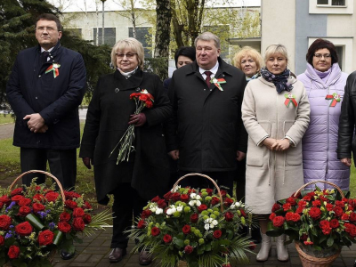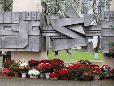 На фото: Возложение цветов к Мемориальному знаку воинам-связистам, погибшим в годы Великой Отечественной войны (г.Минск, ул.П.Бровки, студенческий двор УО «БГАС»)