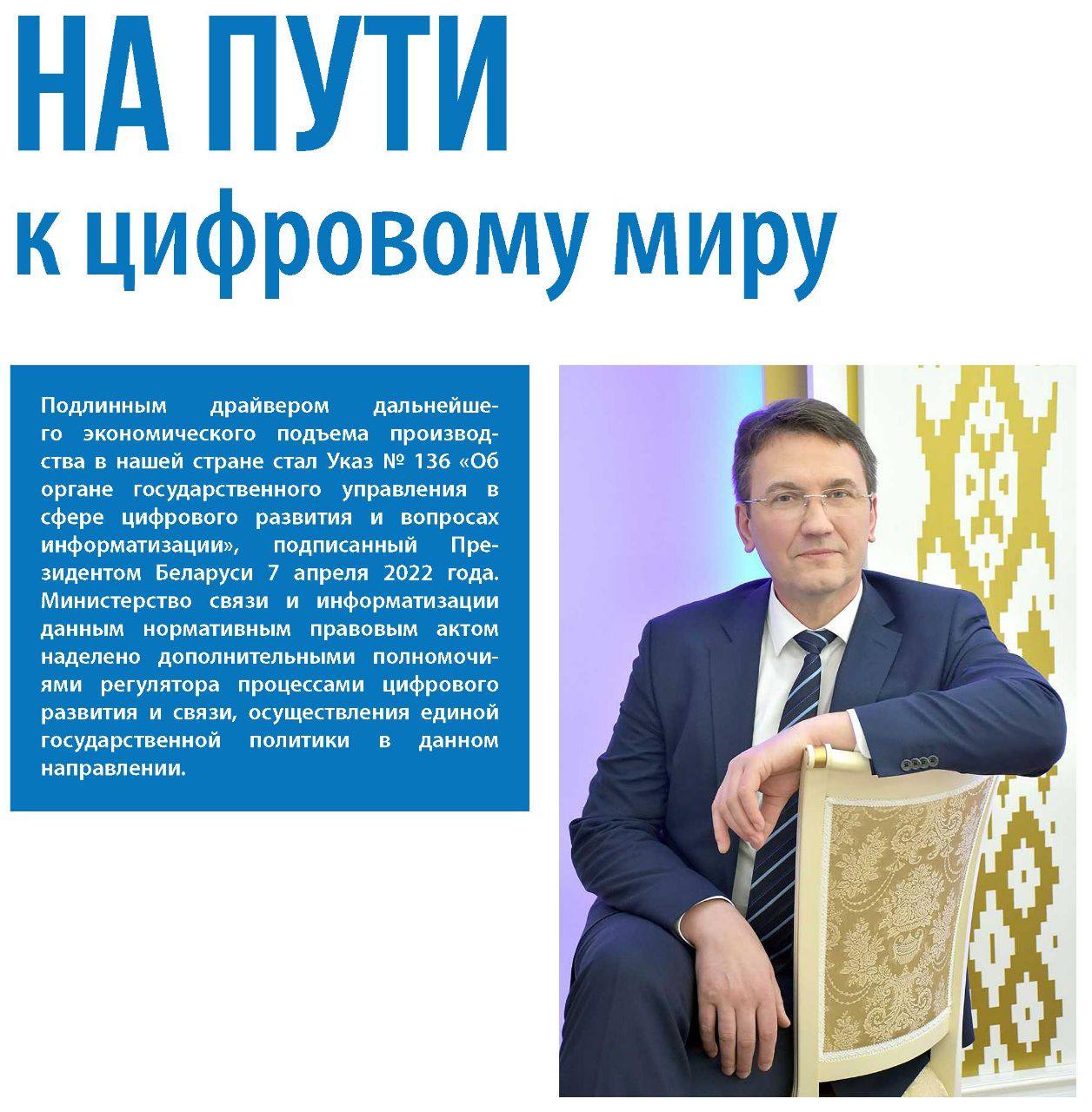Подлинным драйвером дальнейшего экономического подъема производства в нашей стране стал Указ № 136 «Об органе государственного управления в сфере цифрового развития и вопросах информатизации», подписанный Президентом Беларуси 7 апреля 2022 года. Министерство связи и информатизации данным нормативным правовым актом наделено дополнительными полномочиями регулятора процессами цифрового развития и связи, осуществления единой государственной политики в данном направлении.