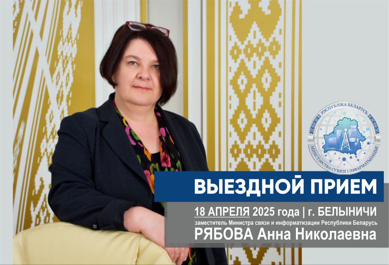 18 апреля 2025 г. с 11:30 до 12:30 заместитель министра связи и информатизации Республики Беларусь Рябова Анна Николаевна проведет выездной прием граждан и юридических лиц в Белыничском участке почтовой связи с одновременным подключением «прямой телефонной линии» +375 2232 7 25 31. Жители Белынич и Белыничского района смогут задать вопросы, затрагивающие деятельность в области связи (как почтовой, так и электросвязи) и цифрового развития. Место проведения приема: г.Белыничи, ул. Ленинская, д.53, кабинет начальника УПС. Предварительная запись на прием осуществляется по 17 апреля с 09:00 до 12:30 и с 13:00 до 17:00 по телефону: +375 2232 7 25 31. Изображение PDF