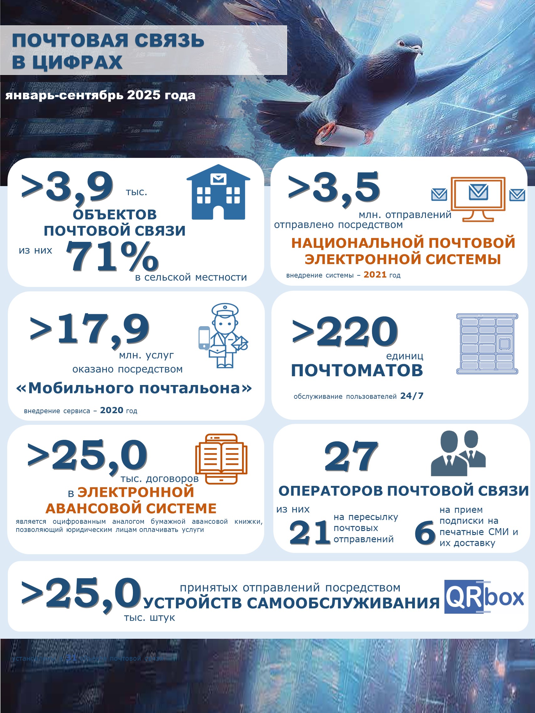У мэтах развіцця лічбавых сэрвісаў з ліпеня 2024 года ўкаранёны сэрвіс па афармленні і аплаце ў асабістым кабінеце паштовага адпраўлення для адпраўкі ў месцах самаабслугоўвання QR box. Адпраўка ажыццяўляецца шляхам сканавання QR-кода ў мабільным дадатку. За студзень-верасень 2025 г. з дапамогай QR box адпраўлена больш за 25,0 тыс. паштовых адпраўленняў.