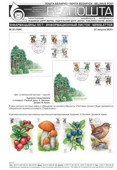 3 верасня 2025 года Міністэрства сувязі і інфарматызацыі Рэспублікі Беларусь выпускае ў абарачэнне дванаццаць паштовых марак васямнаццатага стандартнага выпуску «Дзікая прырода Беларусі».