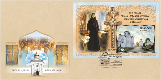 27 мая 2025 года Міністэрства сувязі і інфарматызацыі Рэспублікі Беларусь выпускае ў абарачэнне паштовы блок «900-годдзе Спаса-Еўфрасіннеўскага жаночага манастыра ў Полацку».Дызайн Я. Бядонік.У аснове блока – карціна «Еўфрасіння Полацкая» (мастакі А. Ліпскі і С. Лагуновіч-Чарэпка), фота для маркі і канверта Першага дня У. Суцягіна.Блок друкаваўся ў РУП «Бабруйская ўзбуйненая друкарня імя А.Ц. Непагодзіна».Спаса-Еўфрасіннеўскі жаночы манастыр у г. Полацку заснаваны ў 1125 годзе прападобнай Еўфрасінняй, ігуменняй і князёўнай Полацкай. Яе нятленныя мошчы знаходзяцца ў самым вялікім храме манастыра – Крыжаўзвіжанскім саборы, пабудаваным у 1987 годзе.Жамчужынай комплексу з'яўляецца Спаса-Праабражэнскі храм XII стагоддзя з самым старым фрэскавым роспісам, які захаваўся на тэрыторыі Беларусі, – унікальным творам старажытнарускага манументальнага мастацтва сусветнай значнасці. Для Спаскай царквы ў 1161 годзе па заказе Еўфрасінні майстар-ювелір Лазар Богша стварыў адну з галоўных святынь Беларускай Праваслаўнай Царквы – напрастольны Крыж-каўчэг у старажытнавізантыйскай тэхніцы перагародчатай эмалі (згублены ў 1941 годзе, адноўлены ў 1997 годзе).Архітэктурны ансамбль і тэрыторыя Спаса-Еўфрасіннеўскага жаночага манастыра ўнесены ў Дзяржаўны спіс гісторыка-культурных каштоўнасцей Рэспублікі Беларусь.Праект падрыхтаваны ў супрацоўніцтве з Беларускай Праваслаўнай Царквой.У дзень выпуску паштовага блока ў абарачэнне ў аддзяленні паштовай сувязі № 15 Полацка Віцебскай вобласці будзе праводзіцца спецыяльнае гашэнне на канверце «Першы дзень». Малюнак Малюнак PDF