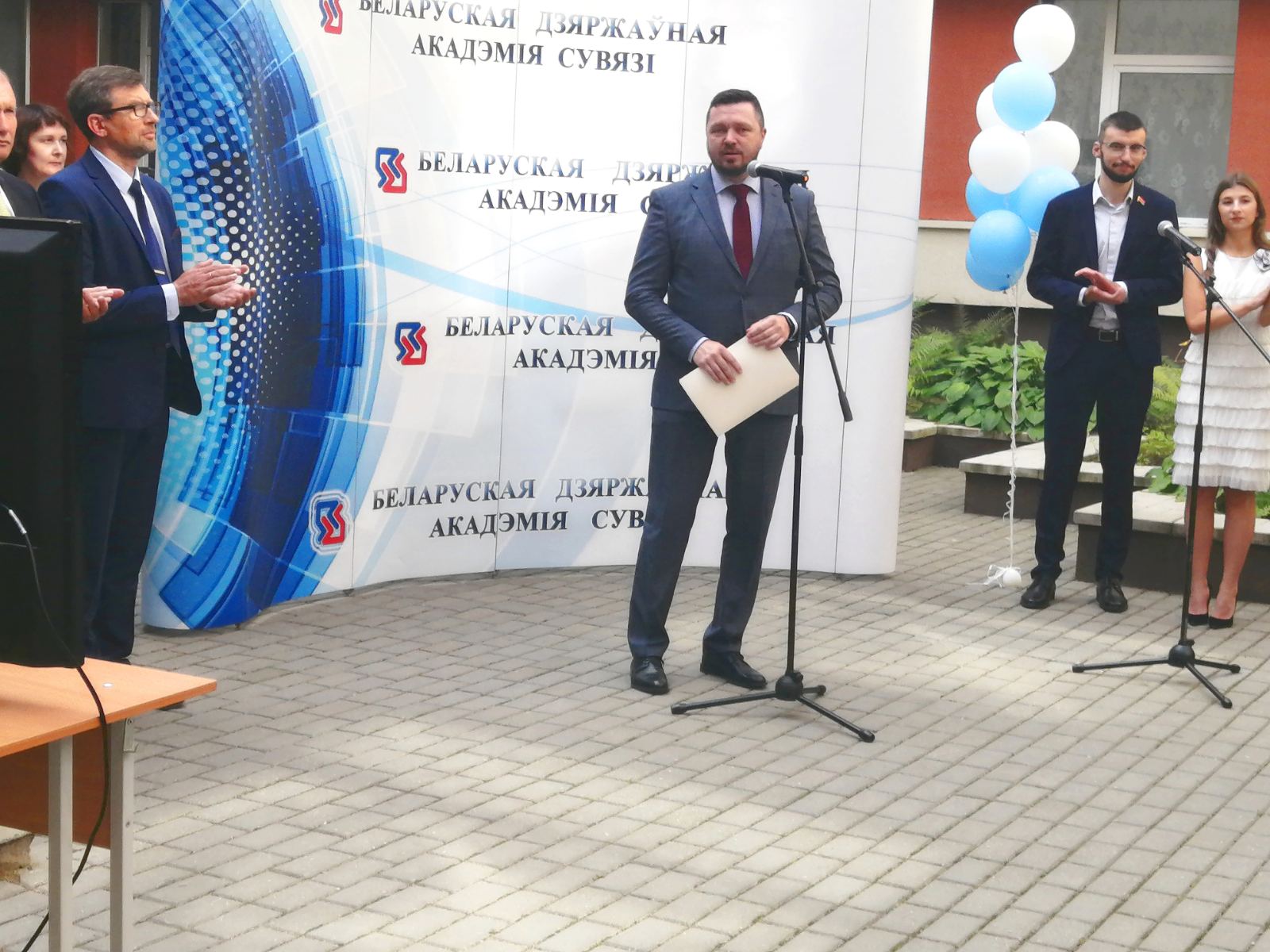 День знаний – поистине важный государственный праздник, которому ежегодно уделяют должное внимание и представители Министерства связи и информатизации. Сегодня на торжественной линейке в Белорусской государственной академии связи присутствовал почетный гость – первый заместитель Министра связи и информатизации Павел Ткач. Поддержать и вдохновить вчерашних абитуриентов, а теперь уже студентов, будущее поколение связистов – великая миссия. Многое в жизни ребят будет зависеть от их самих. Однако важно молодых людей не оставить и без участия и поддержки взрослых и государства. Ведь они должны не только правильно выбрать свой путь, но и не свернуть с него, состояться как личность и специалист. Павел Николаевич зачитал напутственное слова первокурсникам от Министра связи и информатизации Константина Шульгана, где также акцентировалось внимание на важности искреннего стремления к обретению новых знаний и навыков. Прозвучали поздравления и в адрес профессорско-преподавательского коллектива Академии связи. Свои пожелания присутствующим высказал и председатель Белорусского профессионального союза работников связи Александр Яковлев. В ходе торжественной линейки был организован телемост между структурными подразделениями данного учебного заведения, его витебским филиалом и учебным корпусом №2. На торжественной линейке в витебском филиале присутствовала заместитель министра Анна Рябова. В мероприятиях были задействованы представители факультета связи и АСУ Военной академии Республики Беларусь. Состоялось возложение цветов к Мемориальному знаку в память о воинах связистах, свидетелями чего благодаря видеотрансляции могли быть все студенты-связисты и почетные гости. Обозначим, что в этом году двери Академии связи впервые распахнулись перед 1223 поступившими. Наибольшей популярностью у молодых людей пользовались такие специальности, как «прикладная информатика», «системы и сети инфокоммуникаций», «автоматизация технологических процессов и производства». Малюнак Малюнак PDF
