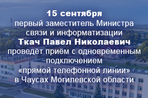 15 сентября с 11:00 до 12:00 первый заместитель Министра связи и информатизации Республики Беларусь Ткач Павел Николаевич проведёт приём граждан и юридических лиц в Чаусском участке электросвязи РУП «Белтелеком» с одновременным подключением «прямой телефонной линии» по телефону: 8 ( 02242) 7 62 31 Жители района смогут задать вопросы, затрагивающие деятельность в области связи (почтовой и электросвязи) и цифрового развития. Предварительная запись на приём будет осуществляться с 11 по 14 сентября с 8:00 до 13:00 и с 14:00 до 17:00 по номерам телефонов в г. Чаусах: 8 (02242) 7 17 66 (7 75 09). Место проведения: улица Ленинская, д. 15, 2 этаж, кабинет 209. PDF