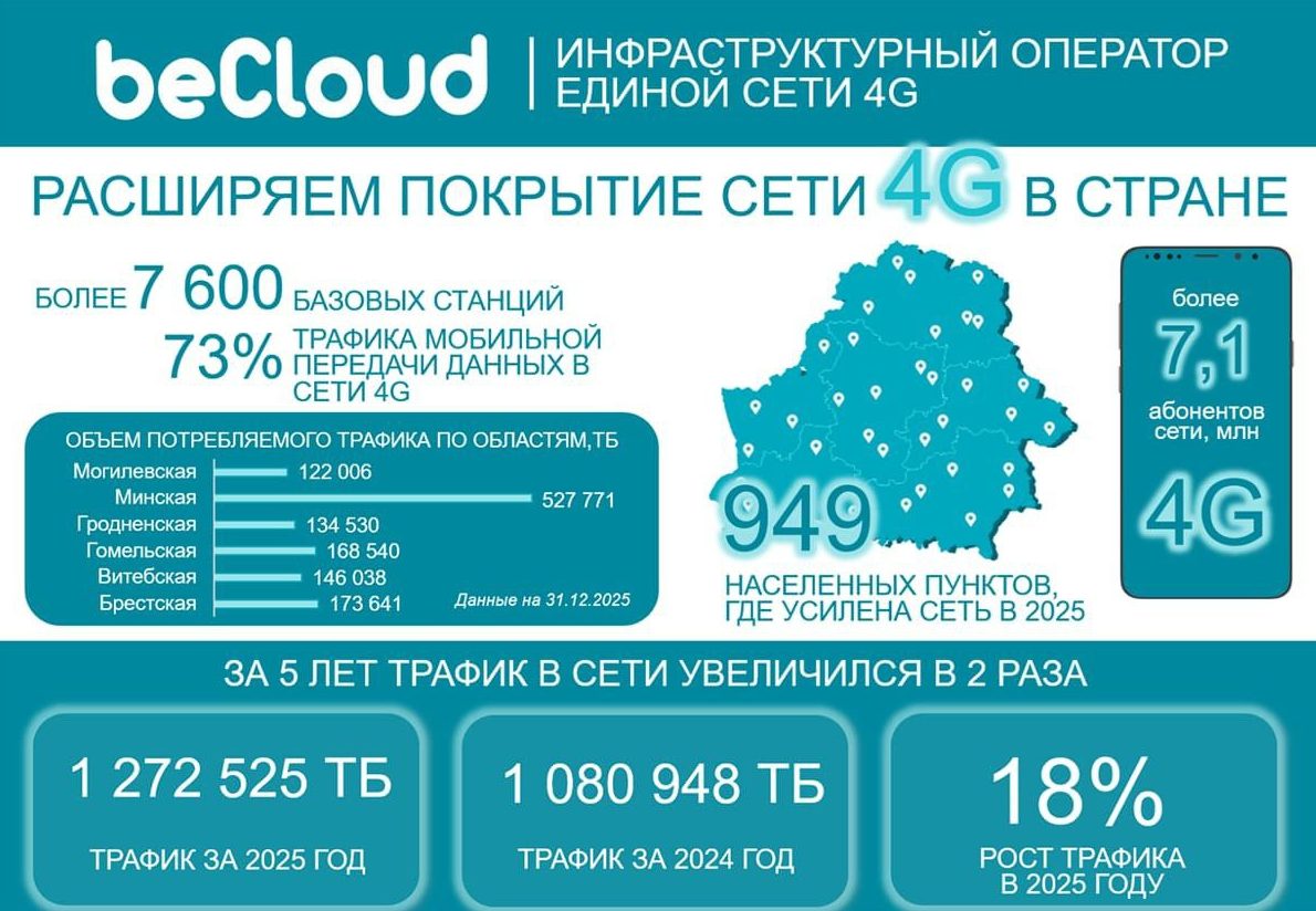 Единый инфраструктурный оператор подвел итоги работы сети 4G в 2025 году. Общий объем мобильного трафика 4G превысил 1,2 млн терабайт трафика, ежесуточно сеть в среднем «прокачивала» более 3 тысячи терабайт данных. Отметим, что три года назад этот показатель составлял 2 тысячи 301 терабайт.73% трафика мобильной передачи данных пользователей в минувшем году проходило в сети 4G. В сравнении с 2024 годом потребление мобильного интернета по технологии LTE увеличилось почти на 18%.За последние 5 лет наблюдается стремительный рост трафика на уровне 15-25%. Лидером по объему мобильного трафика ожидаемо является Минск — 327 тысяч терабайт за 2025-ый год.С подробным материалом, подготовленным beCloud можно ознакомиться по ссылке https://becloud.by/media-center/news/edinyy-infrastrukturnyy-operator-becloud-podvel-itogi-raboty-seti-4g-v-belarusi-v-2025-godu/ Изображение PDF