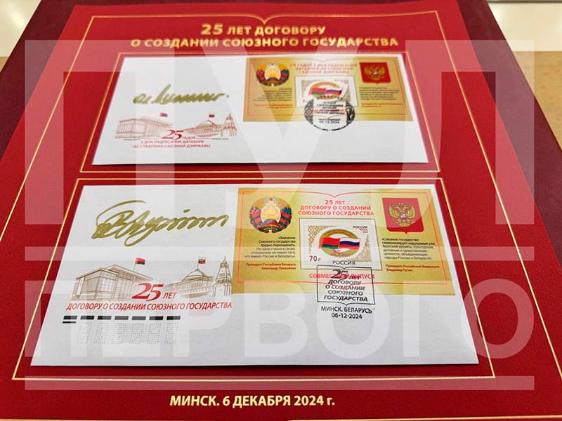 Церемония специального гашения почтовых блоков к 25-летию со дня подписания Договора о Союзном государстве (8 декабря 1999 года) состоялась в Минске во Дворце Независимости, передает корреспондент БЕЛТА. Церемонию провели после заседания Высшего государственного совета Союзного государства. В ней приняли участие президенты Александр Лукашенко и Владимир Путин. На торжественном мероприятии присутствовали высшие должностные лица обеих стран. Источник: Белта Фото: Белта, ПулПервого Картинка марки: Белпочта Изображение Изображение Изображение PDF