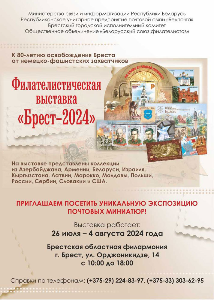 С 26 июля по 4 августа в Бресте будет проходить филателистическая выставка "Брест-2024". Цели проведения выставки: воспитание молодежи на славных боевых традициях и единстве белорусского народа, формирование объективного отношения общества к героическому прошлому; популяризация и развитие филателистического движения, в том числе для сохранения исторического и культурного наследия нашей страны. На торжественном открытии 26 июля с 12.30 планирует принять участие Министр связи и информатизации. Экспозиция специализированной выставки «Брест-2024» объединила в себе филателистические коллекции 85 участников из 13 стран: Азербайджана, Армении, Беларуси, Израиля, Кыргызстана, Латвии, Марокко, Молдовы, Польши, России, Сербии, Словакии, США. Коллекции военной и исторической тематики приурочены к 80-летию освобождения Бреста от немецко-фашистских захватчиков. Необходимо отметить, что тема Великой Отечественной войны широко представлена в выпусках почтовых марок и блоков, конвертов, карточек, открыток. К данной выставке Минсвязи и РУП «Белпочта» подготовили почтовый проект, состоящий из художественного маркированного конверта и специального памятного штемпеля, использовать который можно на протяжении всей выставки. Место проведения: г.Брест, ул. Орджоникидзе, 14. Изображение PDF