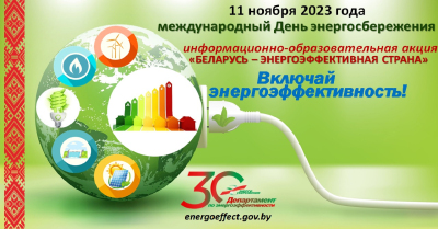 С 8 по 11 ноября 2023 г. Департамент по энергоэффективности Госстандарта  проводит республиканскую информационно-образовательную акцию «Беларусь – энергоэффективная страна» под девизом «Включай энергоэффективность!». Она приурочена к международному Дню энергосбережения, который ежегодно отмечается 11 ноября.