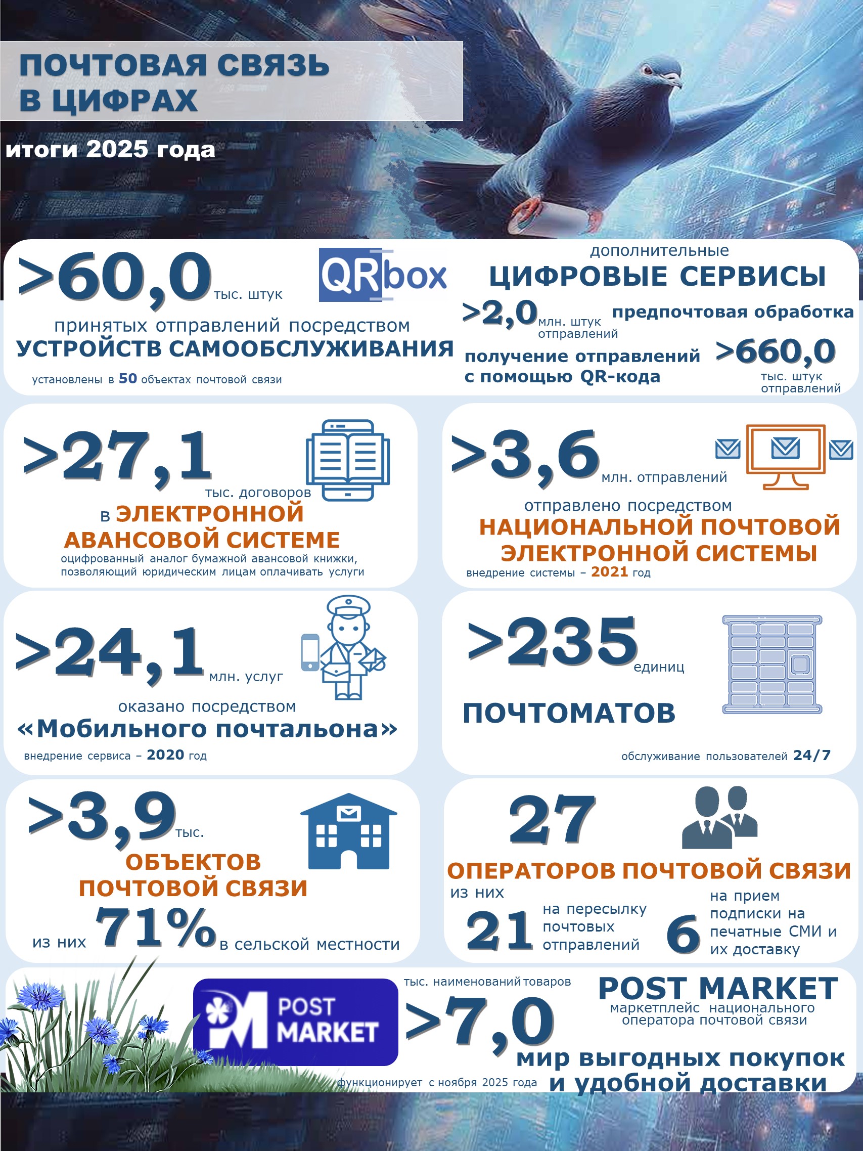 Финансово-экономические показатели и показатели энергосбережения по системе Минсвязи за 2025 годФинансово-экономические показателиЯнварь-декабрь (факт)Темп роста, %Выручка от реализации продукции (работ, услуг), тыс. руб. 3 161 054 109,9Прибыль от реализации продукции (работ, услуг), тыс. руб.291 903 116,1Чистая прибыль, тыс. руб. 283 374 112,6Рентабельность продаж, %9,2 +0,5 п.п.Среднемесячная зарплата, руб.2 593,1 116,8 Иные показателиЯнварь-декабрь (задание)Январь-декабрь (факт)Энергосбережение, %-4,0-4,5Доля местных видов топлива, в т.ч. ВИЭ, %74,0/43,177,6/48,7Экономия ТЭР, т у.т.1161,51295,7Экономия светлых нефтепродуктов, %4,24,3Лом черных/цветных металлов, тонн849/10971300/1350Показатели развития электросвязи (тыс. абонентов)наименование показателя 01.01.202501.01.2026прирост к пред. периодуАбоненты ШПД всего по РБ, в т.ч.13 024,713 414,5 389,8беспроводной ШПД9 740,510 011,7 271,2стационарный ШПД: 3 284,23 402,8 118,6из них РУП "Белтелеком"2 551,52 606,6 55,1Беспроводной ШПД на 100 жителей 106,9 109,9 3,0Стационарный ШПД на 100 жителей 36,1 37,4 1,3Абоненты IPTV,тыс.2 462,32 463,5 1,2из них РУП "Белтелеком"1 938,21 893,3- 44,9Абоненты GPON,тыс.3 052,93 158,7 105,8Абоненты IMS,тыс.3 806,13 809,2 3,1Показатели развития электросвязи за 2025 годПоказатели почтовой деятельности за 2025 год PDF