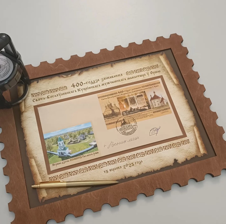 В Городском Дворце культуры «Орша» в рамках праздничных мероприятий, приуроченных к 400-летию основания Свято-Богоявленского Кутеинского мужского монастыря в Орше», состоялась презентация почтового проекта. В мероприятии приняли участие: Митрополит Минский и Заславский Вениамин, Патриарший Экзарх всея Беларуси, Министр связи и информатизации Республики Беларусь Константин Шульган. С 1992 года Министерством связи и информатизации Республики Беларусь и РУП «Белпочта» совместно с Белорусской Православной Церковью подготовлено к выпуску большое количество почтовых проектов христианской тематики. Обращаясь к присутствующим, глава Минсвязи Константин Шульган отметил: Почтовый блок, который посвящен 400-летию основания Свято-Богоявленского Кутеинского мужского монастыря в Орше, изготовлен с применением послепечатных технологий. Это своего рода шедевр, как и само изображение на почтовом блоке. Благодаря Вам, уважаемый Владыка Вениамин, наши совместные проекты продолжаются. Они являются уникальным способом позиционирования идей православия, которые помогают нашим гражданам в укреплении силы духа и веры на благо нашего государства. Надеюсь на дальнейшее плодотворное сотрудничество. Свято-Богоявленский Кутеинский мужской монастырь – православный монастырь XVII века. Расположен на окраине Орши у впадения реки Кутеинки в Днепр. Днем основания монастыря считается 19 сентября 1623 года, когда фундатор Богдан Стеткевич дал дарственную на монастырь. При лавре действовала типография, где работал Спиридон Соболь, который в 1631 году издал свой знаменитый «Букварь» – первый на белорусских землях. Изображение Изображение PDF