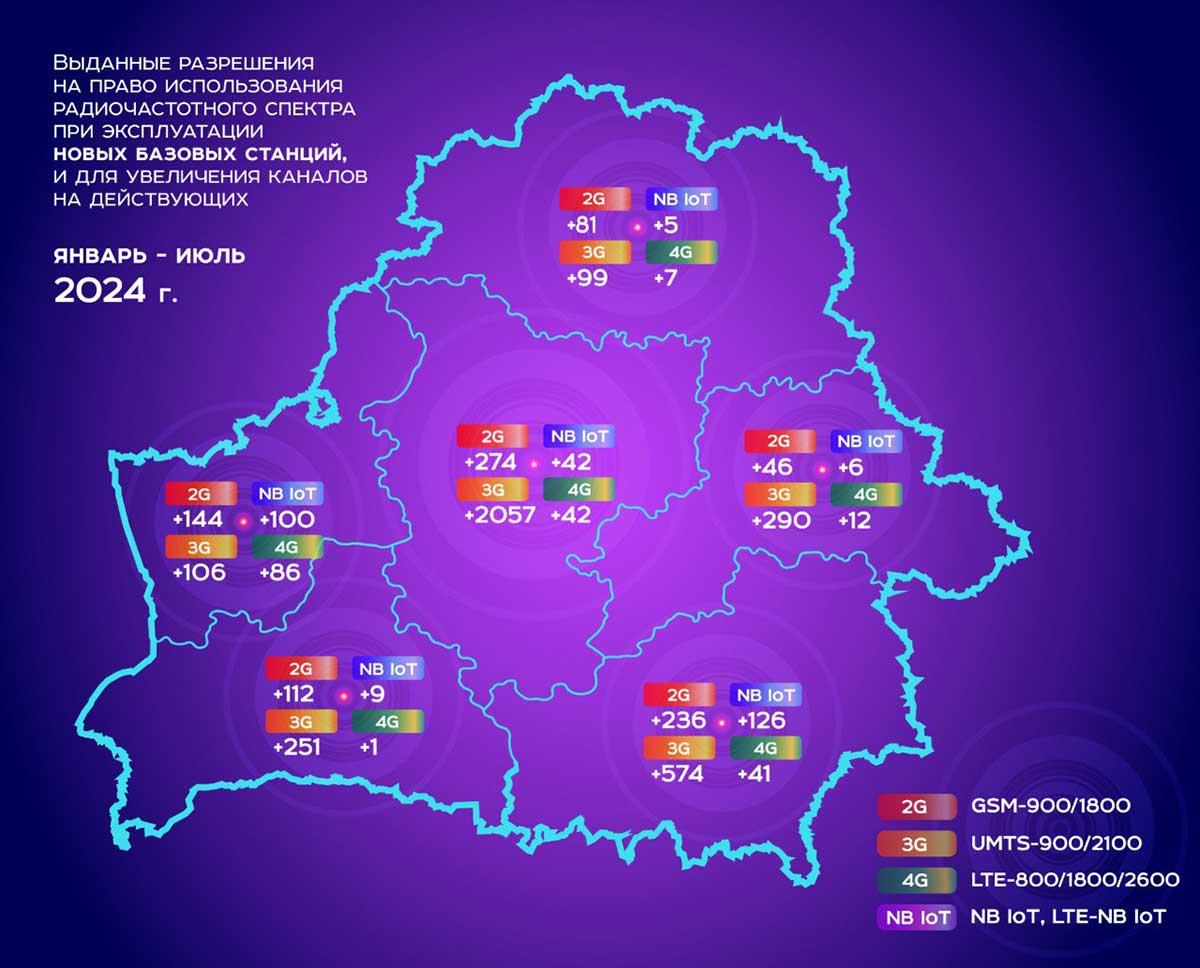 БелГИЭ активно содействует операторам сотовой связи в развитии их сетей. С начала 2024 года специалистами предприятия выдано разрешений на право использования радиочастотного спектра: 🔼 3286 – при эксплуатации базовых станций стандартов GSM (2G), UMTS (3G), LTE (4G) и NB IoT для увеличения количества радиочастотных каналов (емкости сетей сотовой связи) 🔼 1461 – при эксплуатации новых базовых станций, в том числе: GSM (2G) в диапазонах 900/1800 МГц – 34;UMTS (3G) в диапазонах 900/2100 МГц – 951;LTE (4G) в диапазонах 800/1800/2600 МГц – 188;NB IoT – 288. Изображение PDF