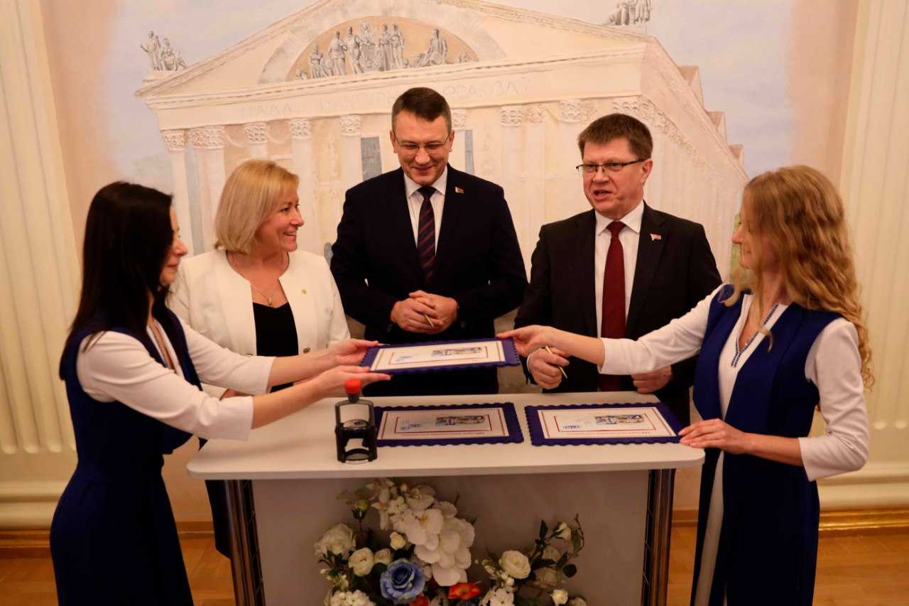 Сегодня, 31 января, Министерство связи и информатизации Республики Беларусь выпускает в обращение памятный специальный штемпель, посвященный 120-летию профсоюзного движения Беларуси. К данному событию также приурочен выпуск художественного маркированного конверта. В церемонии официального гашения художественного конверта специальным штемпелем «120-летие профсоюзного движения Беларуси», которая прошла во Дворце профсоюзов, приняли участие:🔹Председатель Федерации профсоюзов Беларуси Юрий Сенько,🔹Министр связи и информатизации Республики Беларусь Константин Шульган,🔹генеральный директор РУП "Белпочта" Светлана Юркевич. Сегодня Федерация профсоюзов Беларуси – это национальный профсоюзный центр, главным направлением деятельности которого является защита трудовых, социально-экономических прав и законных интересов членов профсоюзов. В белорусской почтовой летописи существуют яркие, разноплановые страницы, посвященные профсоюзному движению:2004 год: художественный маркированный конверт «100 лет профсоюзному движению работников связи»; 2010 год: блок почтовых марок «Профсоюзное движение в Беларуси. VI съезд профсоюзов Беларуси»;2014 год: почтовая марка «110 лет профсоюзному движению Беларуси»; 2019 год: художественный маркированный конверт «115 лет профсоюзному движению Беларуси»;2024 год: художественный маркированный конверт «120 лет профсоюзному движению Беларуси». Представленные почтовые выпуски – свидетельство значимости профсоюзного движения в нашем государстве, его влияния на развитие общества. Изображение Изображение PDF