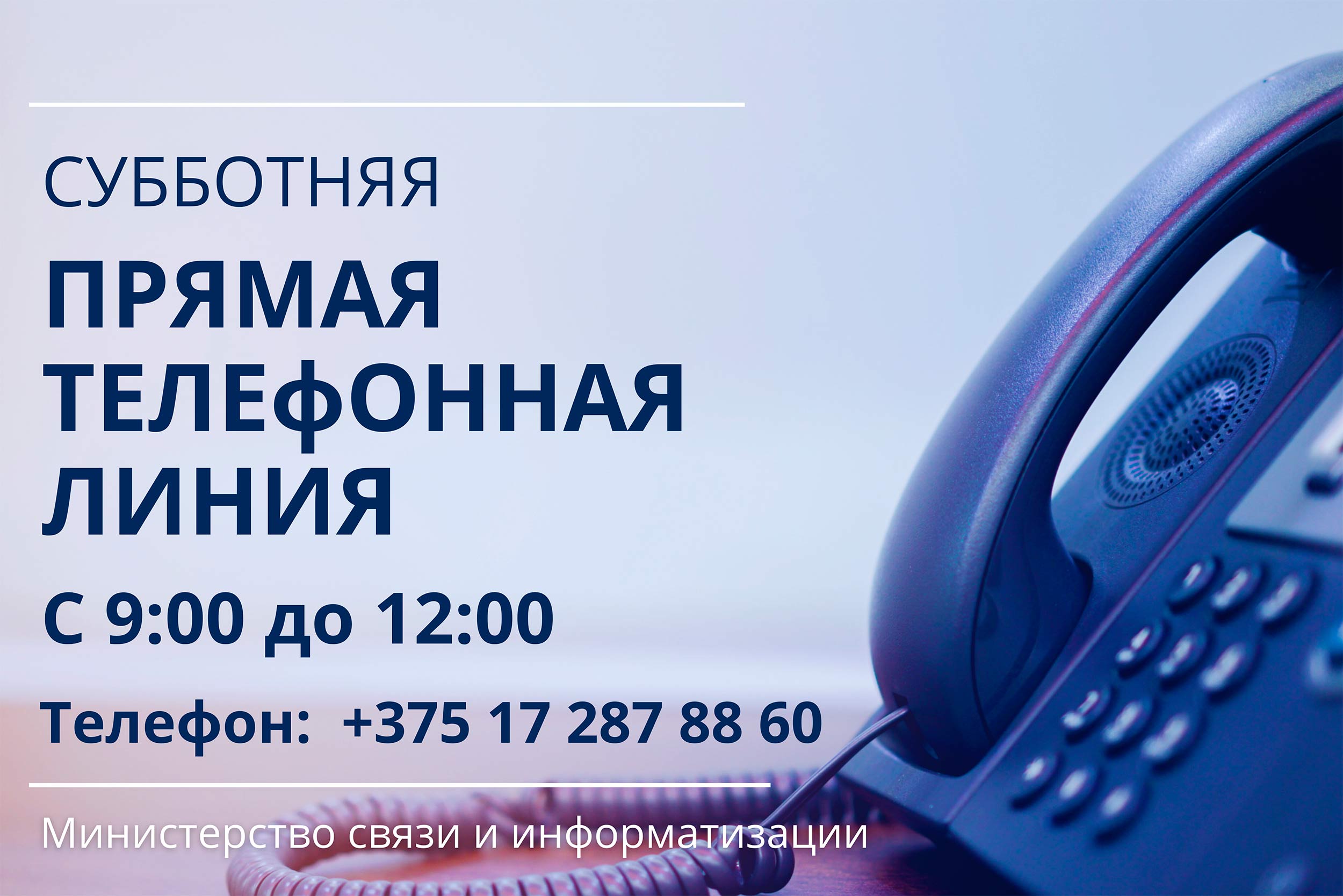 Каждую субботу в Минсвязи организована «прямая телефонная линия» с 9.00 до 12.00 по телефону+375 (17) 287 88 60. 26 октября на вопросы ответит начальник управления международной деятельности Минсвязи Гурин Валерий Иванович. Информируем о том, что параллельно в РУП «Белтелеком», РУП «Белпочта», СООО «МТС» и УП «А1» организованы «прямые телефонные линии» с руководством. Так, 26 октября на вопросы ответят: заместитель генерального директора РУП «Белпочта» Герасимёнок Вадим Михайлович по телефону +375 (17) 293 55 48 заместитель генерального директора по цифровому развитию и информационным технологиям РУП «Белтелеком» Буйницкий Сергей Александрович по телефону +375 (17) 217 10 77 исполняющий обязанности директора Витебского филиала – начальник технического отдела Витебского филиала СООО «МТС» Шефиев Руслан Рафекович по телефону +375 (33) 905 00 38 заместитель генерального директора по коммерческим вопросам УП «А1» Левданский Юрий Владимирович по телефону +375 (44) 705 62 94 К сведению: каждый четверг с 15:00 до 17:00 для обратной связи с абонентами life: работает прямая телефонная линия +375 (25) 909 20 20 c руководством компании. Изображение PDF