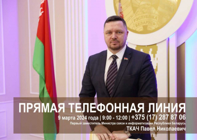 9 марта 2024 года субботнюю «прямую телефонную линию» с 9.00 до 12.00 по телефону +375 (17) 287 87 06 проведёт Первый заместитель Министра связи и информатизации Республики Беларусь Ткач Павел Николаевич Необходимо отметить, что параллельно в РУП «Белтелеком», РУП «Белпочта» и СООО «МТС» организованы «прямые телефонные линии» с руководством. Так, 9 марта на вопросы ответят: заместитель генерального директора по техническим вопросам РУП «Белтелеком» Жаркевич Андрей Ромуальдович по телефону +375 (17) 217 10 77; заместитель генерального директора по техническим вопросам РУП «Белпочта» Потапенко Сергей Александрович по телефону +375 (17) 293 55 48; заместитель Генерального директора по техническим вопросам СООО «Мобильные ТелеСистемы» Тяжких Алексей Павлович по телефону: +375 33 9050038. PDF