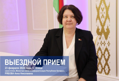 23 февраля 2024 года с 12:00 до 13:00 заместитель Министра связи и информатизации Республики Беларусь Рябова Анна Николаевна проведет выездной прием граждан и юридических лиц в Клецком участке почтовой связи Слуцкого регионального узла почтовой связи Минского филиала РУП «Белпочта» с одновременным подключением «прямой телефонной линии». Жители города Клецка и Клецкого района смогут задать вопросы, затрагивающие деятельность в области связи (как почтовой, так и электросвязи) и цифрового развития. 📍Место проведения приема: г. Клецк, пл. Маяковского, 3, кабинет № 4. 📞Телефон для проведения «прямой телефонной линии» 8 (01793) 6-89-60 📝Предварительная запись на прием будет осуществляться с 19 по 22 февраля с 10.00 до 12.00 по телефону 8 (01793) 5-50-98 PDF